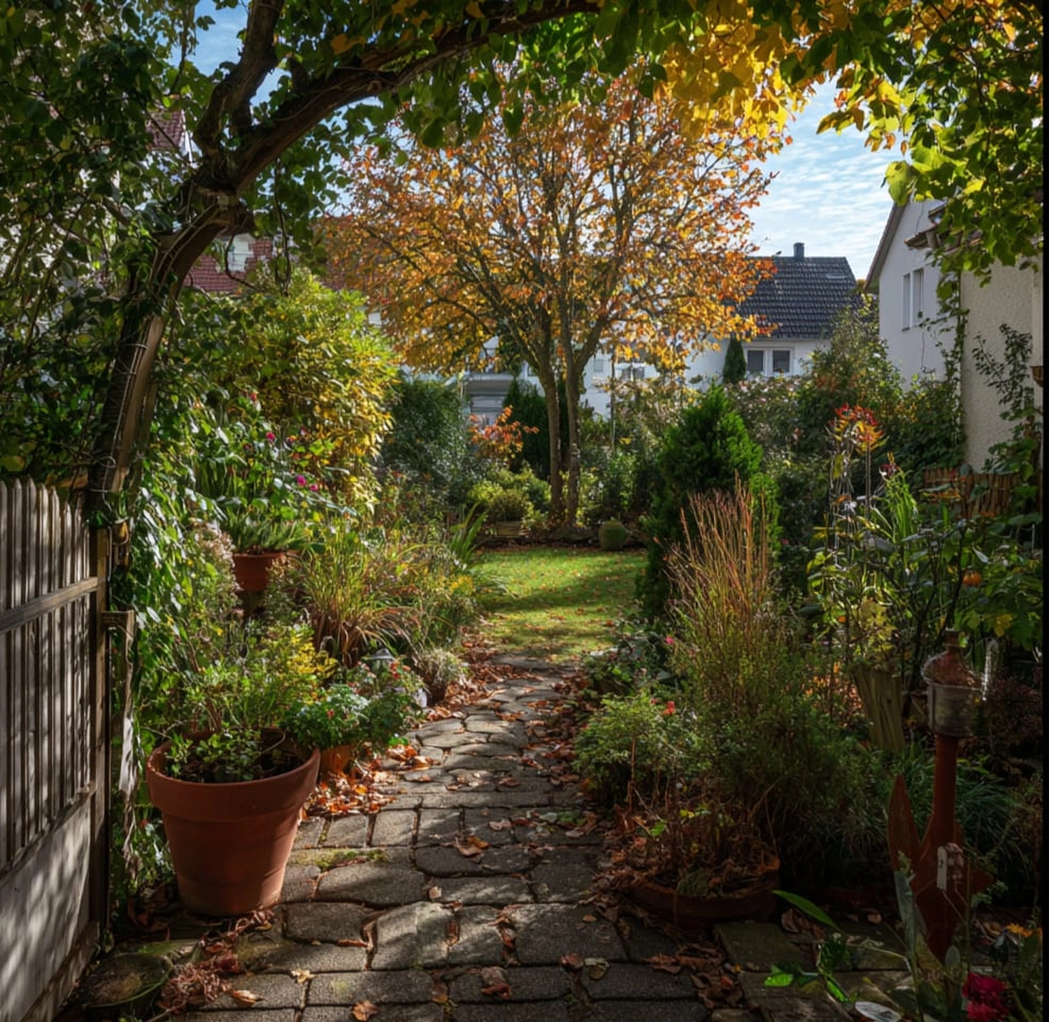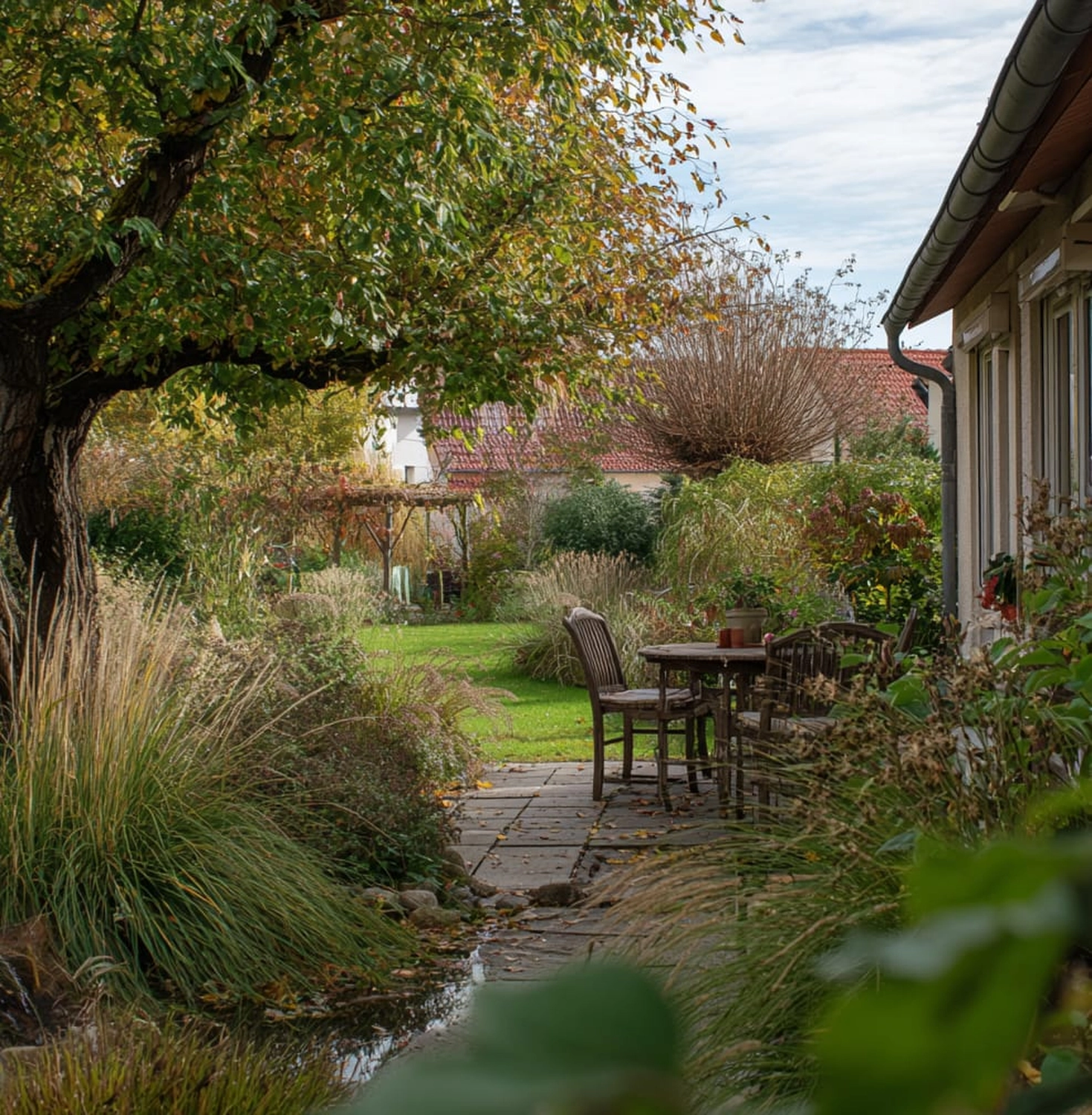 Ein professionell gestalteter Privatgarten im November, aufgenommen.