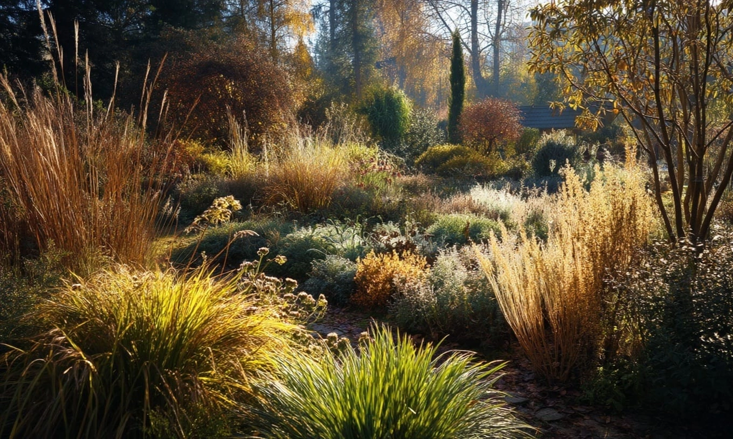 Spätherbstliche Staudenrabatten mit strukturreichen Gräsern (Miscanthus, Panicum, Pennisetum) und im November attraktiven Stauden (Aster, Sedum, Rudbeckia-Samenstände). Eindrucksvolle Ziersträucher mit ihren verbliebenen Herbstfarben in warmen Gold-, Bernstein- und Kupfertönen. Sanftes, tiefstehendes Novemberlicht erzeugt zarte Lichter und lange Schatten. Leichte Morgenfrische, dezenter Tau auf dem Laub, naturalistische Bepflanzung, harmonische Kompositionen in einer friedlichen und eleganten Gartenstimmung.